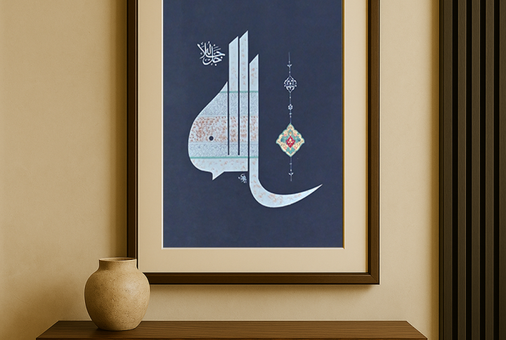 “Indeed, in the remembrance of Allah do hearts find peace,” is beautifully inscribed in Thuluth script, known for its graceful flow and spiritual presence.